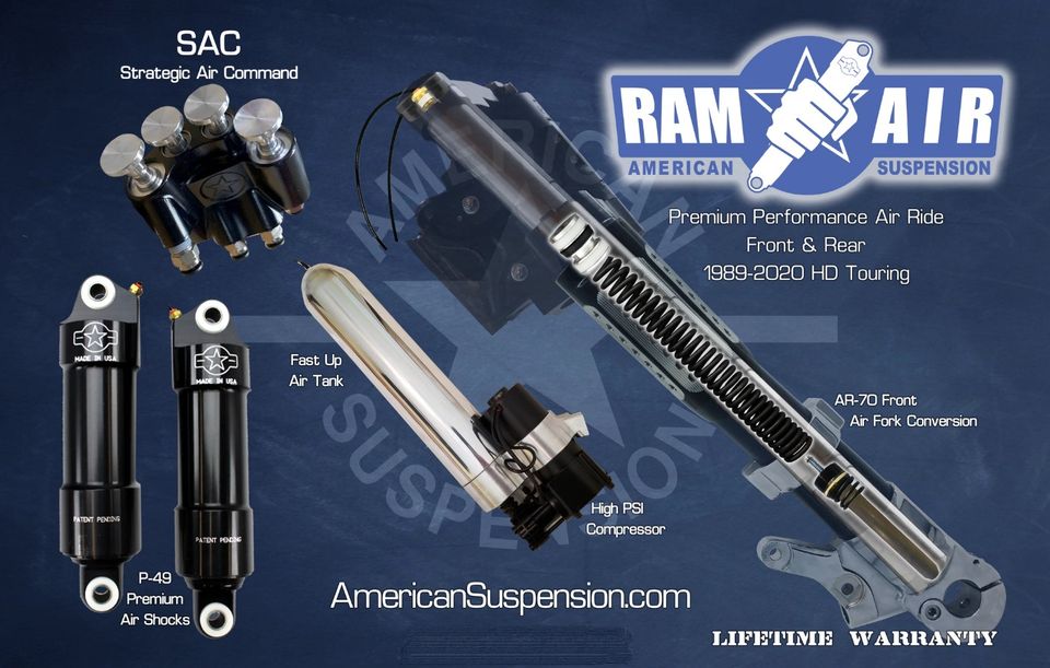 P-49™ air shock combines the precision road holding of a racing shock with the butter soft ride of luxury. The amazing P-49™ uses adaptive control valving ™combined with user adjustable Strategic Air Command Module™. RAM AIR™ is the Air ride system you have been waiting for. Compare the American Suspension RAM AIR™ to any other air system and you will see the remarkable ease of use offered with RAM AIR™. RAM AIR™ is plug and play like no other. Instead of littering components about the bike, the American Suspension® RAM AIR ™ incorporates everything into a single chunk of Made in the USA Billet 6061-T6. You just attach two bolts and plug everything in – and you are done. As simple as the RAM AIR ™ is to install, the inner working of the P-49 are highly complex. Multiple valving circuits seamlessly transition the ride from a bumpy back road to gliding down a smooth slab. The entire billet suspension unit is coated in our proprietary MOS2X™ coating. This miracle coating all but eliminates friction and provides a magic ride. Unlike our competitors the AMERICAN SUSPENSION P-49 is machined from aerospace materials right here in the USA. If you love to ride your bike, ride American Suspension.