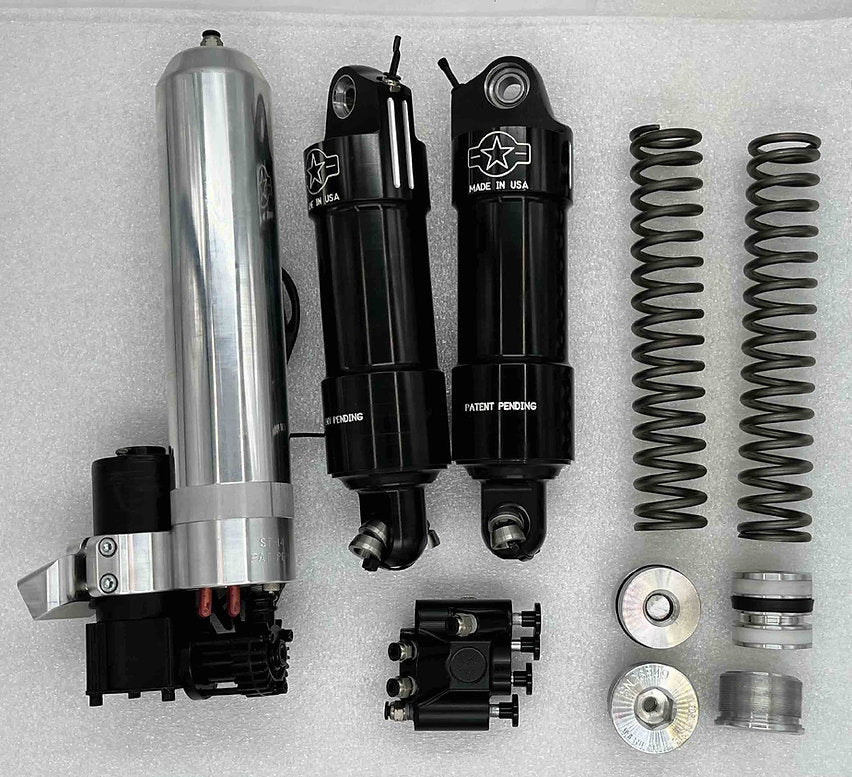 Includes a pair of P-49 Supreme ride shocks utilizing the patented Strategic Air Command Module to control the Ram Air SuperTanker System. Pump, SAC, and mounting hardware with complete PLUG & PLAY wiring harness for rear air shock system.