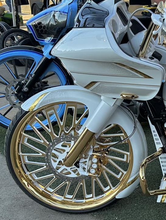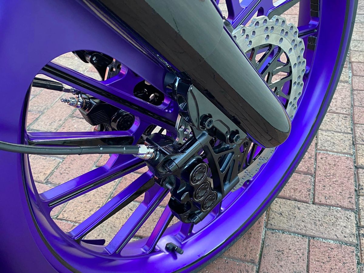 Another first from American Suspension. Add that custom color to your brake caliper to match the rest of your bike. It's a subtle touch but it screams FULL CUSTOM. Available in Red, Blue, Black, Raw, Chrome, Gold, or Bronze.
