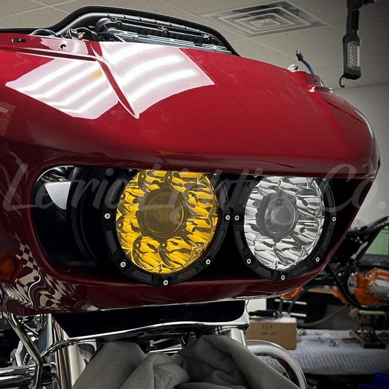 Dual 7″ Road Glide Headlamp complete with black powder-coated aluminum bracket, stainless steel hardware & 100% plug-n-play wiring harness. This European-Style aggressive headlight design is captured with (1) clear lens LED (running light) and (1) clear lens LED (both work on high beam) boasting over 8000 lumens per LED. Simple to install and built to last, this dual 7″ LED headlight will shed some serious light on the competition!