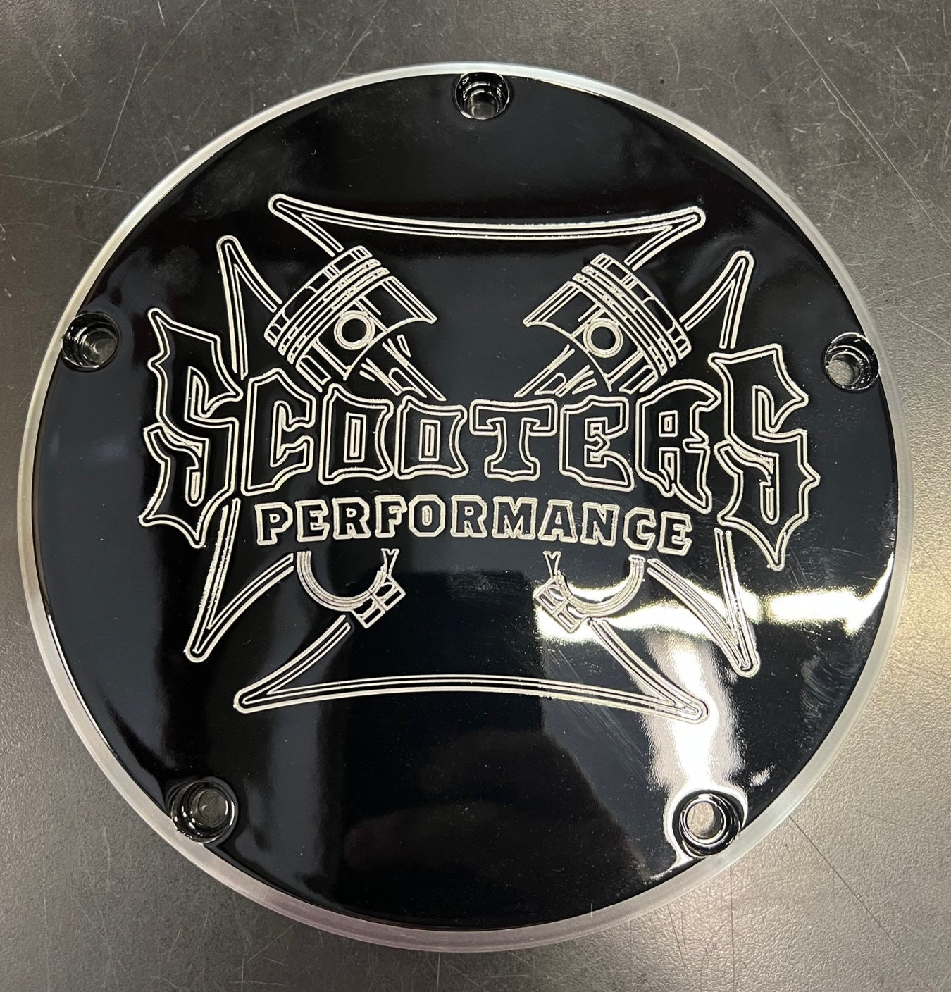 Billet Aluminum derby cover for Harley Davidson M8 & 16up Twin Cam models. Coated in gloss black with Scooters Performance logo engraving.