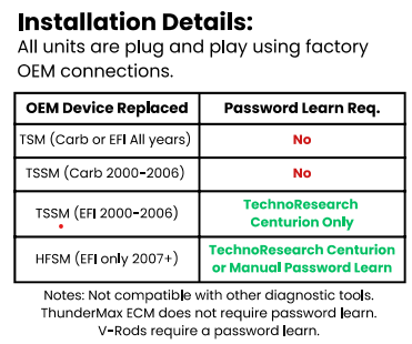 The module is compatible with both LED and incandescent bulbs, supporting a turn signal load range of 0.24A to 6A per side, eliminating the need for a load equalizer or Signal Stabilizer when converting to BCM compliant LED turn signals. It follows OEM TSM manual password learning procedure and is compatible with TechnoResearch module replacement procedure. The unit offers both manual and self-canceling turn signal functions, based on speed, timing, and direction of the motorcycle. Additionally, it supports full operation of four-way hazards along with upgraded, smart cancellation based on time, ignition position, and battery voltage. Included is an automatic shut-off feature when the vehicle tilt exceeds 45 degrees to either side for more than one second. Additional safety is integrated with the OEM safety switches to prevent starting in gear without either in neutral or the clutch pulled. Designed for low current consumption, the module also incorporates built-in short circuit and overcurrent protection. Constructed with robust, high-quality components, it is backed by a three-year manufacturer warranty and operates within a wide voltage range of 11VDC to 15VDC.