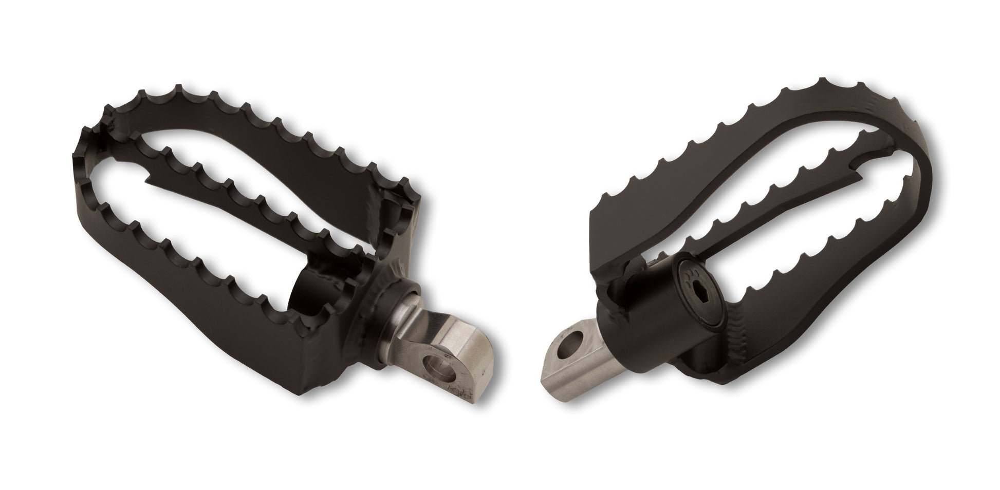 Inspired by the bear trap style of the 70's motocross bikes and designed to fit your street machine.Our steel mx style pegs offer an adjustable clevis with built-in teeth that will bite down and clock them to your liking; they also feature a serrated edge to keep your feet planted.These pegs are tig welded for strength and powder coated satin black to blend nicely with your bike.We also designed a built-in bottle opener for all the party starters out there! may require modification of clevis on some sportster models