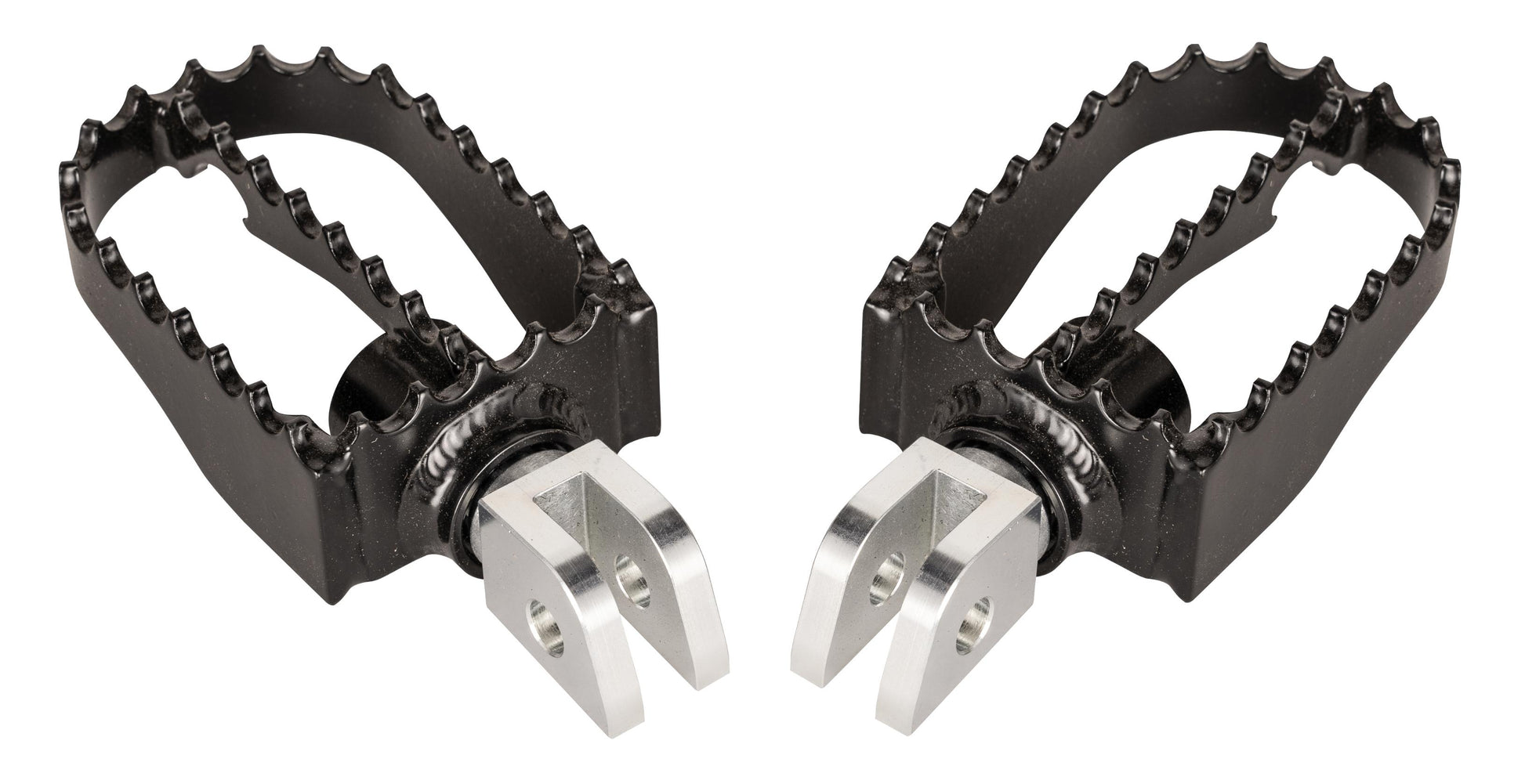 Inspired by the bear trap style of the 70's motocross bikes and designed to fit your street machine.Our steel mx style pegs offer an adjustable clevis with built-in teeth that will bite down and clock them to your liking; they also feature a serrated edge to keep your feet planted.These pegs are tig welded for strength and powder coated satin black to blend nicely with your bike.We also designed a built-in bottle opener for all the party starters out there! may require modification of clevis on some sportster models